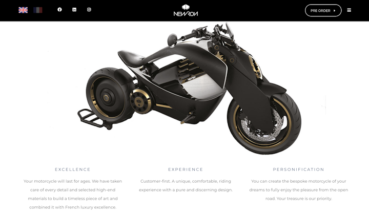 PROJECT: In absolute silence, the Newron EV-1 motorcycle lets you revel in the open road. With nearly 300 km (180 mi) of range, the EV-1 will take you further than any other electric motorcycle on the market today. We imagined the sensations of tomorrow in designing a high-end motorcycle today which combines the best technologies and materials to offer you a unique experience. You become one with the machine.